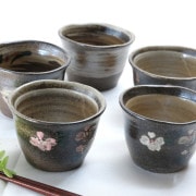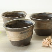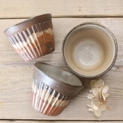 益子の粘土を使い、炭化焼という薪で燻す焼成方法で焼き上げられた、土の味わいを生かした陶器です。手に持ってみると土のぬくもりが伝わります。また表面は薄めに釉薬を掛けておりますので、熱の熱さが伝わりにくいのも魅力です。絵付けはひとつひとつ職人が絵付けしておりますので微妙に異なります。