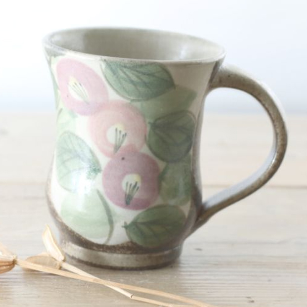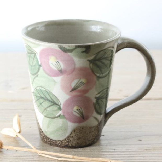 益子焼窯元よこやまのお手頃なサイズの小さめビールジョッキです。ストレートの下がスリム形です。取っ手もしっかりと付けてあります。マグカップとしてお使いいただいても大丈夫な大きさ。いろいろなお飲み物でお楽しみください。優しい色使いのつばき模様がひとつひとつ手書きで絵付けされております。
