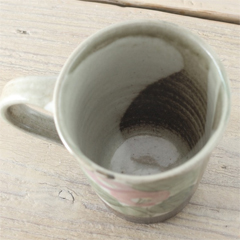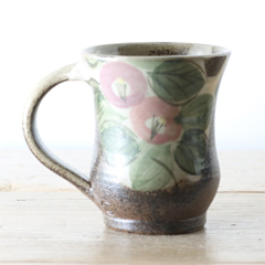 益子焼窯元よこやまのお手頃なサイズの小さめビールジョッキです。形は下の部分がふっくらとした形。取っ手もしっかりと付けてあります。マグカップとしてお使いいただいても大丈夫です。いろいろなお飲み物でお楽しみください。優しい色使いのつばき模様がひとつひとつ手書きで絵付けされております。